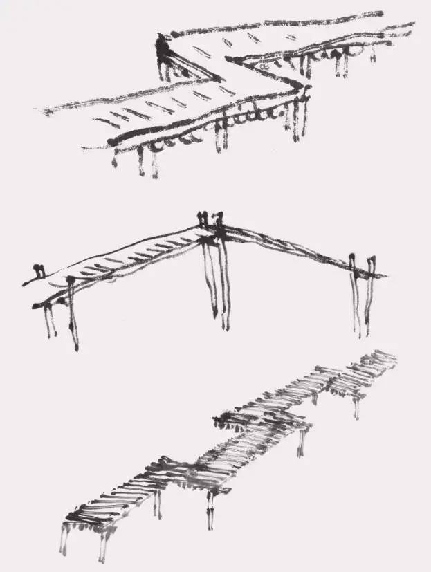 木桥是建造桥梁时以木扳为原料的桥,结构相对简单。因此,绘制时墨线不宜过于粗糙,要表现出木板光滑的质感。