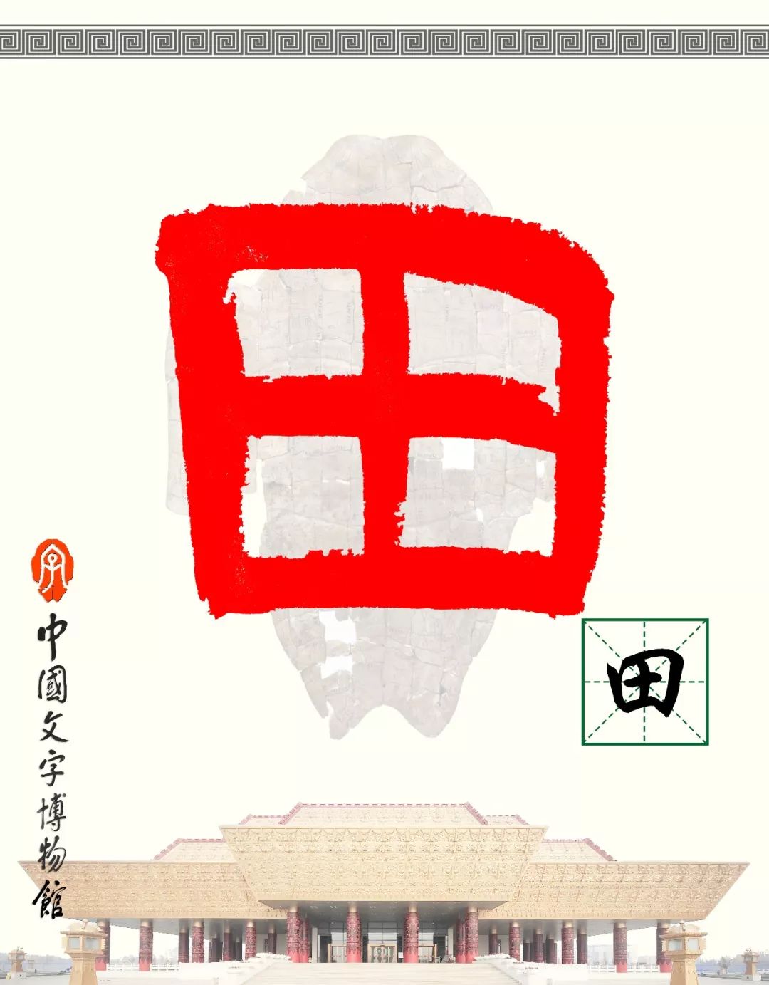 田:外像田地的边缘,内像纵横的小路。甲骨卜辞中既指农耕之田,也指田猎之畋。在六书中属于象形。