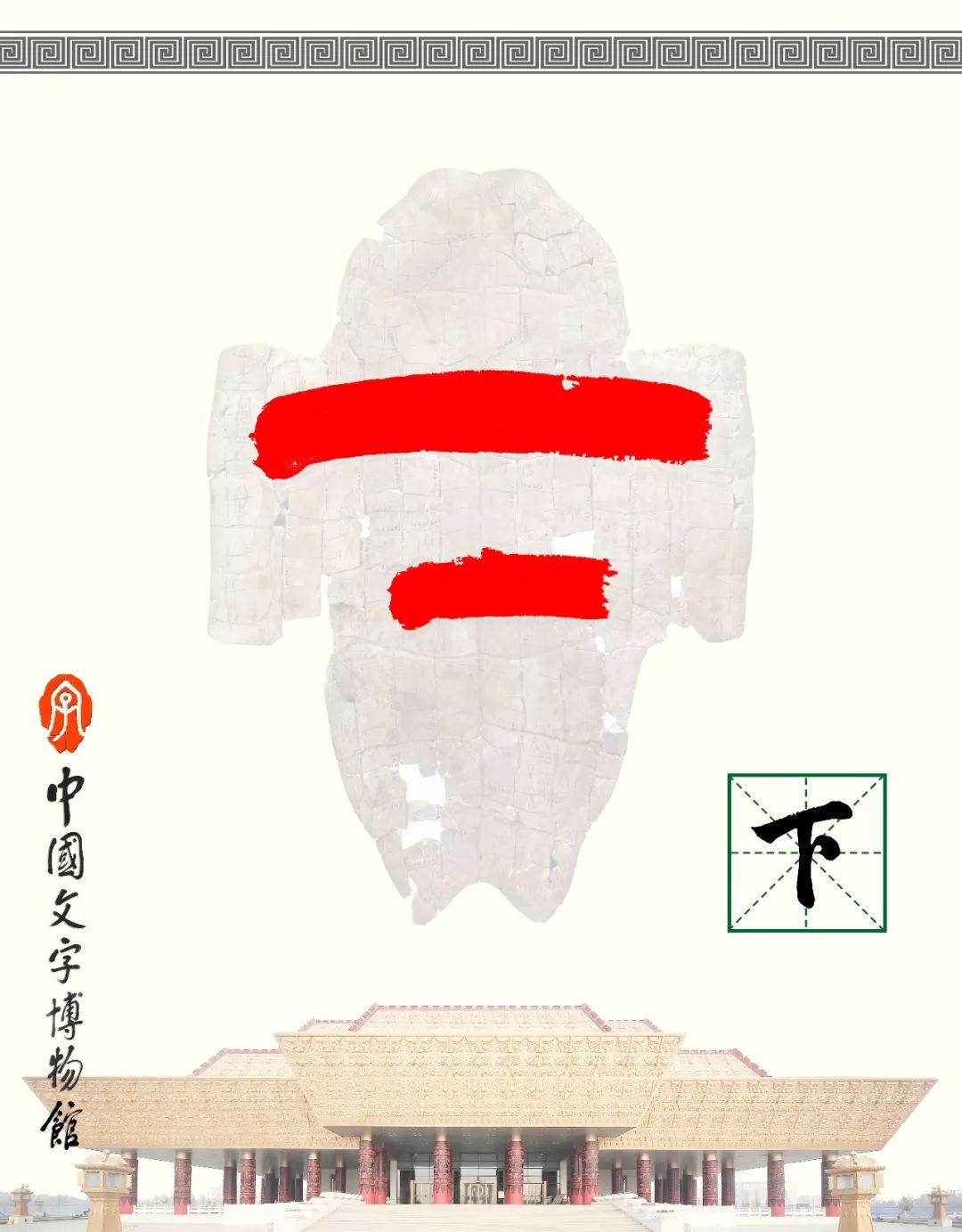 下:短横在长画之下,表上下之下。卜辞中还用做先王名号和地袛神。在六书中属于指事。