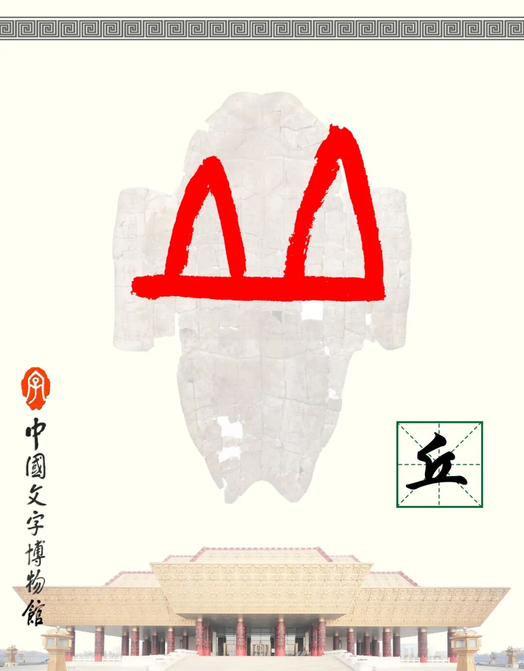 丘:像小山二峰隆起的样子。商承祚以为“丘为高阜,似山而低,故甲骨文作两峰”。季旭昇说:“三峰为山,两峰为丘”。卜辞中也用作地名和官职名。在六书中属于象形。徐中舒则认为,甲骨文丘像“穴居两侧高出地而之出入孔之形”。备为一说。