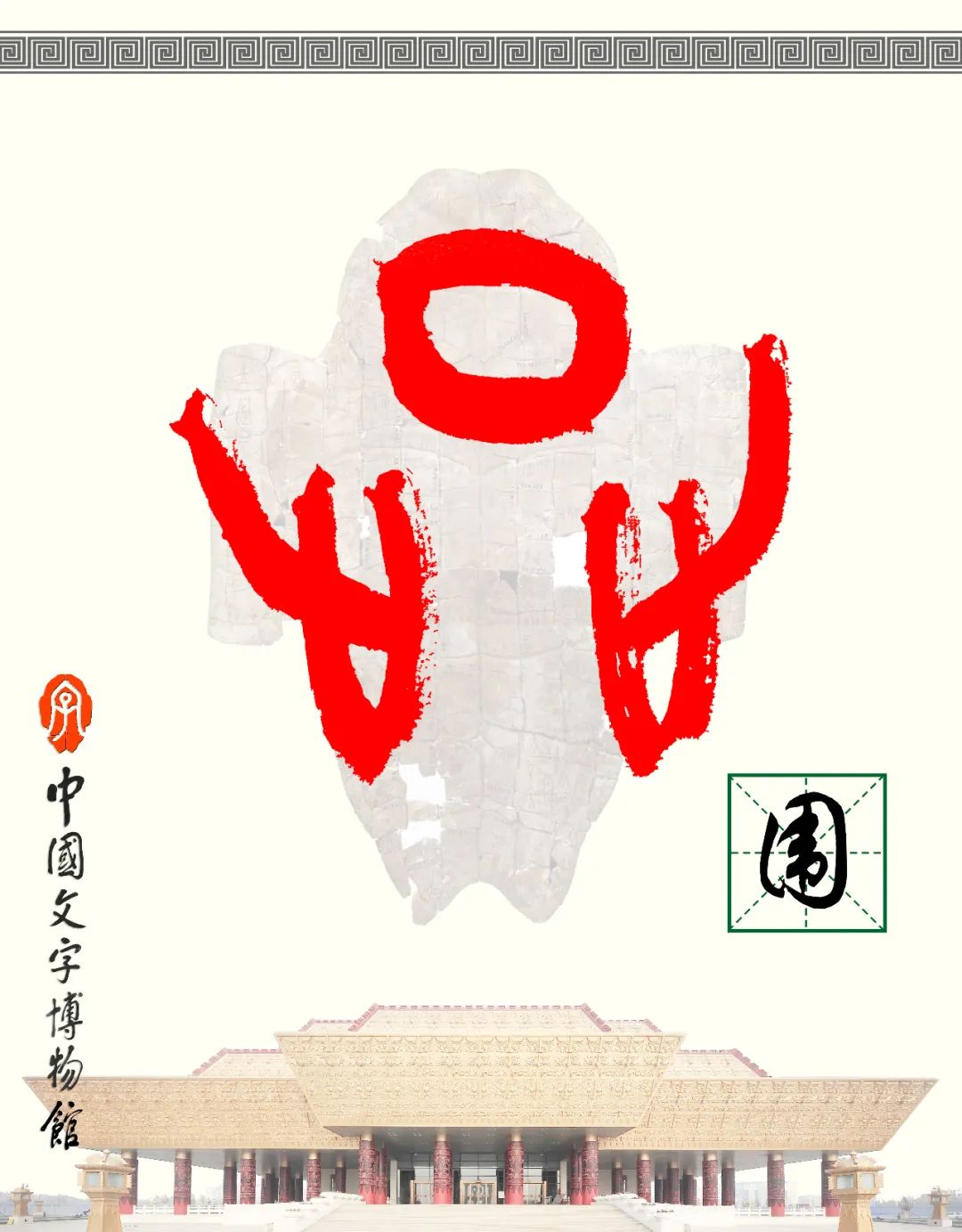 围:从二止或四止围“囗”,“囗”表示城邑,会包围之意,“囗亦声”。卜辞中用作征伐,也用作地名。在六书中属于会意兼形声。